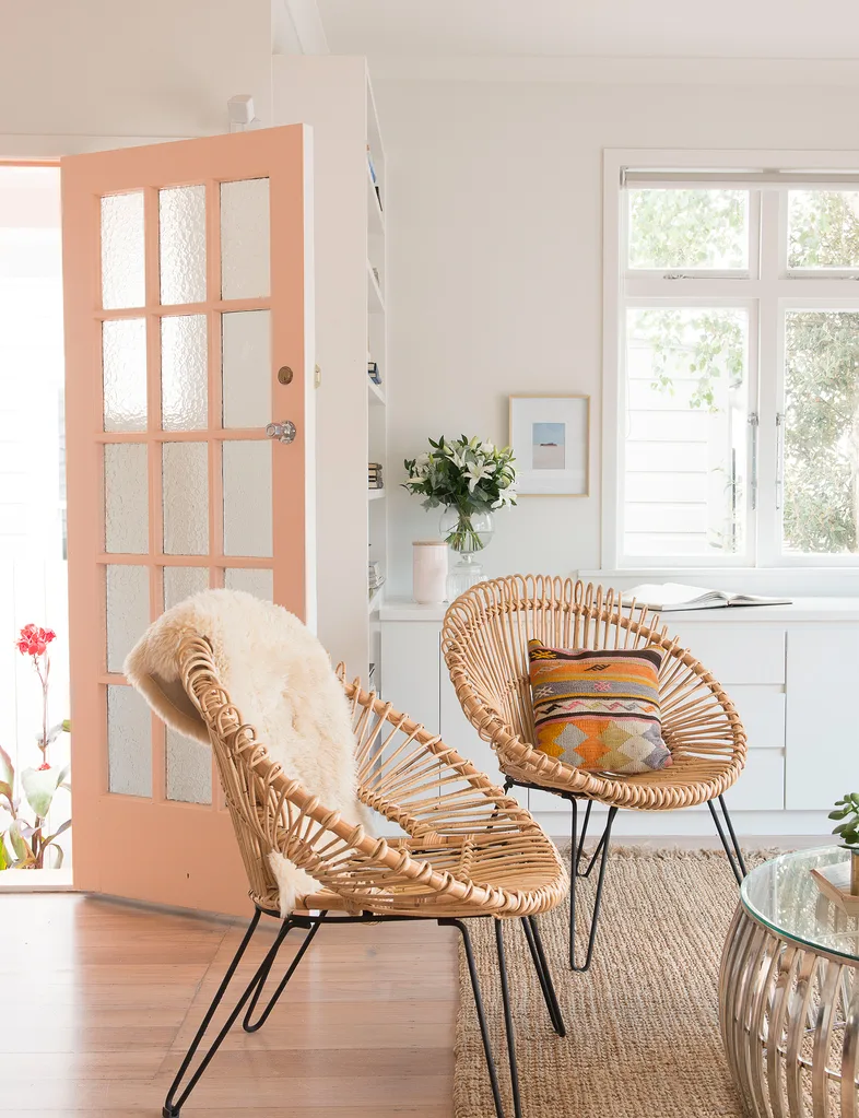 This peach front door is the perfect starting note at this relaxed, boho home.