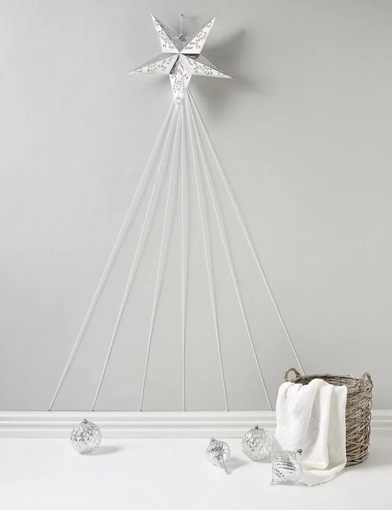 Alternatively, decorate it with wallpaper. To make this version of the flat plywood tree, take a sheet of plywood and cut into a triangle (ours is 181cm tall by 120cm wide). Lay the triangle on the floor and roll a piece of wallpaper down the middle. Use either glue or double-sided tape to fix the wallpaper on the board. Trim off excess and secure the edges at the back of the triangle. If the lower corners are still showing, cut two more pieces of wallpaper to cover them up, ensuring you line up the pattern; trim and secure as before. Now simply lean your ‘tree’ against a wall and top with a star.