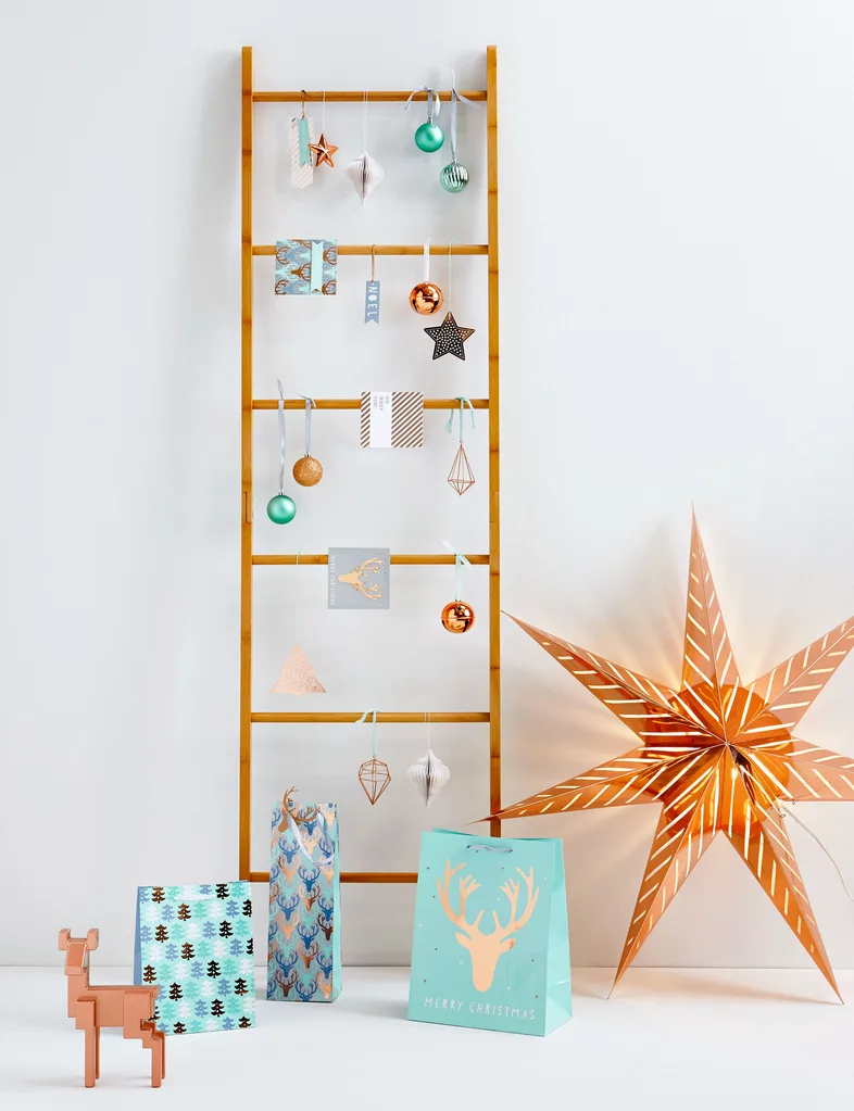 A wooden ladder is the perfect fit for this minimalist, handcrafted look. If you’re living in a small space, such as an apartment or tiny home, this alternative tree is perfect as it doesn’t crowd the living area.