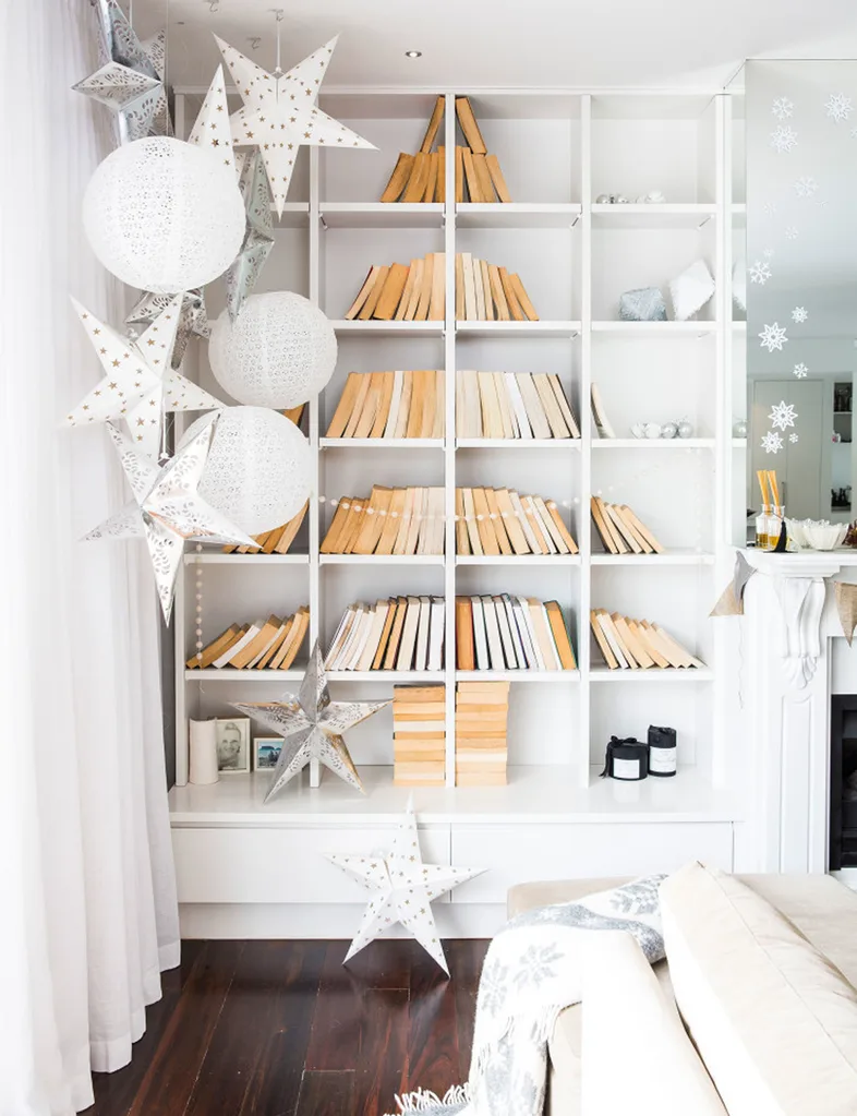 Create this tree by turning your books so their spine faces the back of the bookshelf, or – if you have enough – take all your green-toned books and have the spine facing outwards. Then, hang garlands across the shelves and position baubles beside the books.