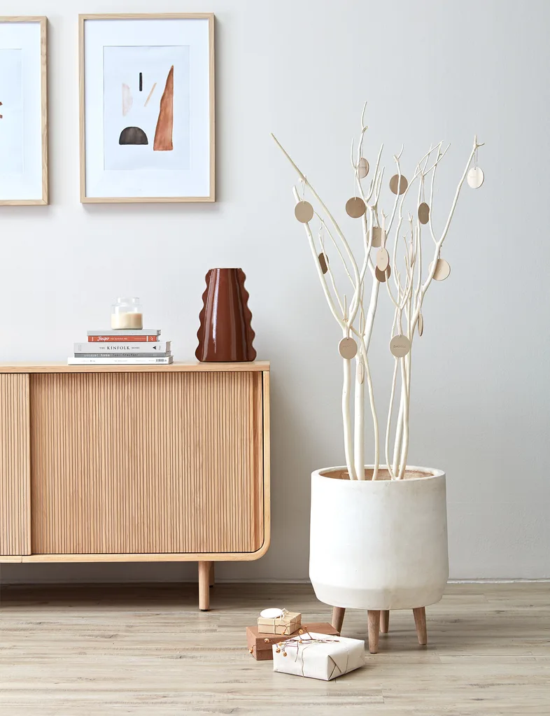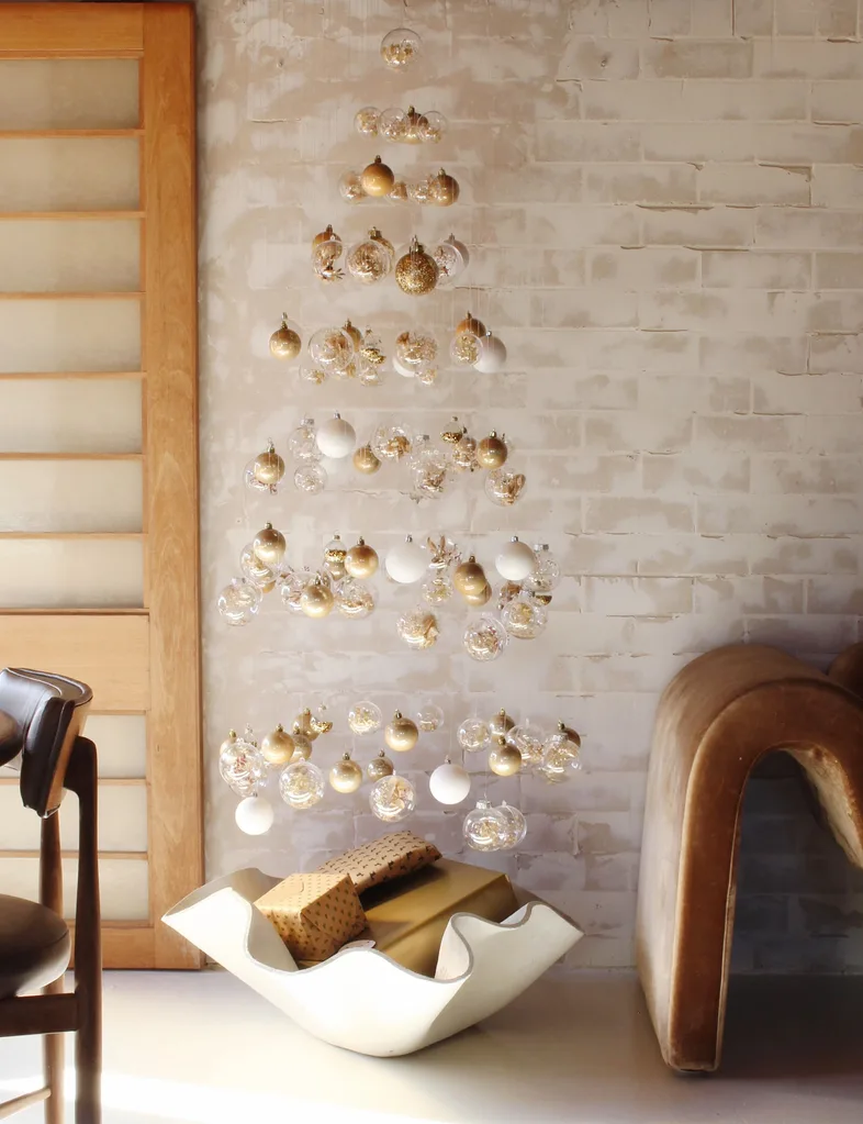 This alternative Christmas tree idea is perfect for small spaces. Pick a bunch of foliage from your garden and arrange it in your favourite vase. Then, hang decorations and fairy lights over and around the foliage. Once your foliage dies, either swap it out for some new cuttings or strip the dead leaves off and hang new decorations off the bare branches.