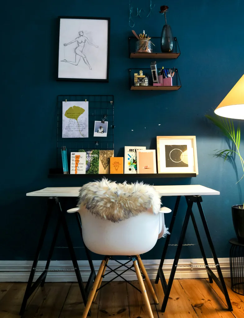 Use colours that make you feel welcomed when you sit down to start work. Remember that blues and greens tend to be calming and improve your concentration and efficiency, whereas reds, oranges and yellows are energising and stimulating when used in moderation. Add texture, warmth and sound cushioning with a rug under the desk.