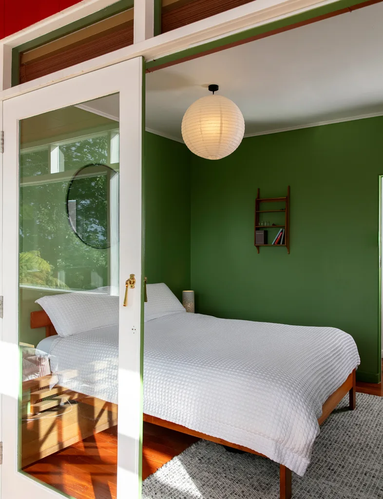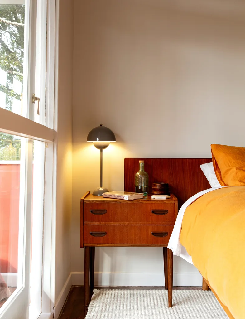 Amongst the couple’s many treasures are Sam’s prized mid-century Trade Me finds, such as a walnut bedhead with matching bedside tables. The wardrobe doors were recovered from a Remuera house reno, with hand-turned handles and a beautiful veneer grain. Unable to resist, the couple have eight more of these doors in the basement awaiting the right project to use them on.