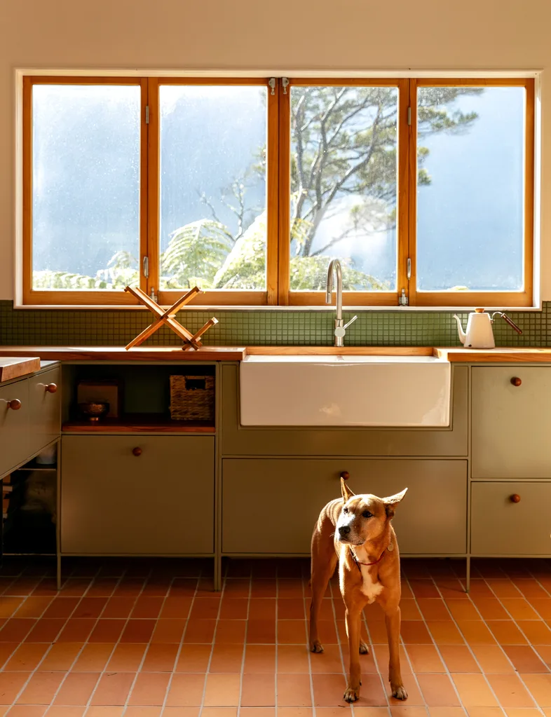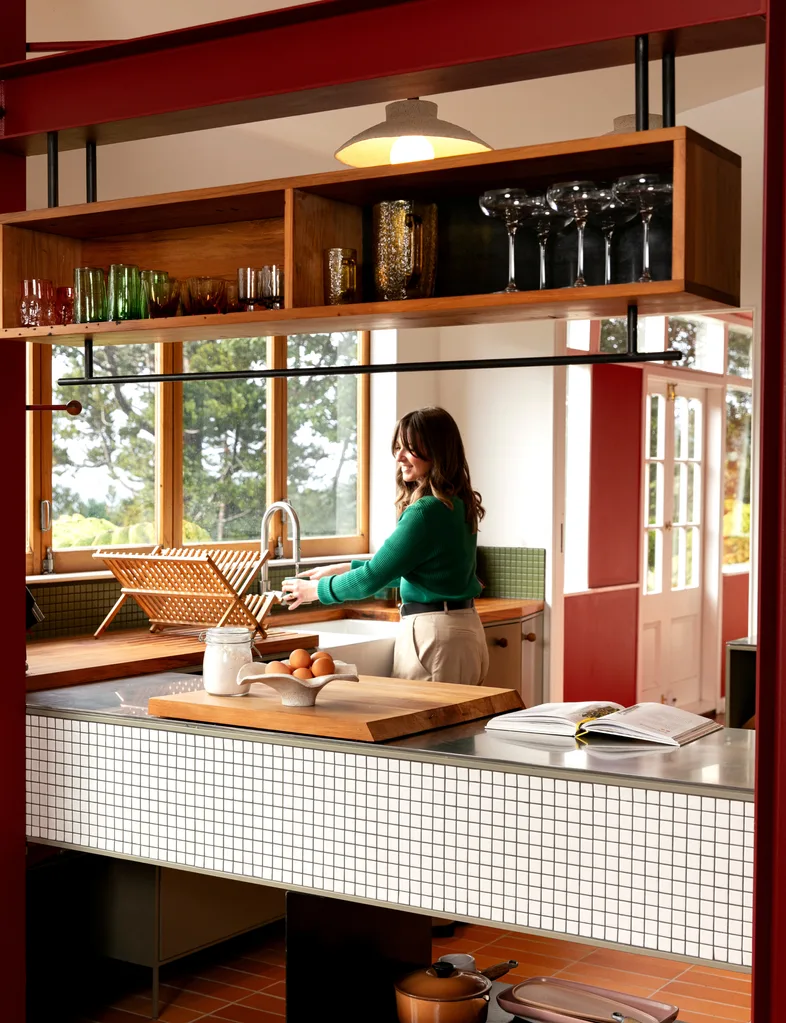 Much of the cabinetry is made from recycled rimu. The colour palette of the kitchen is inspired by the native bush, from the lichen hue of the tiles to the pōhutukawa red of the steel beam. Industrial designer Tom Lopes created custom lamp shades mixed with black sand as a nod to the West Coast.